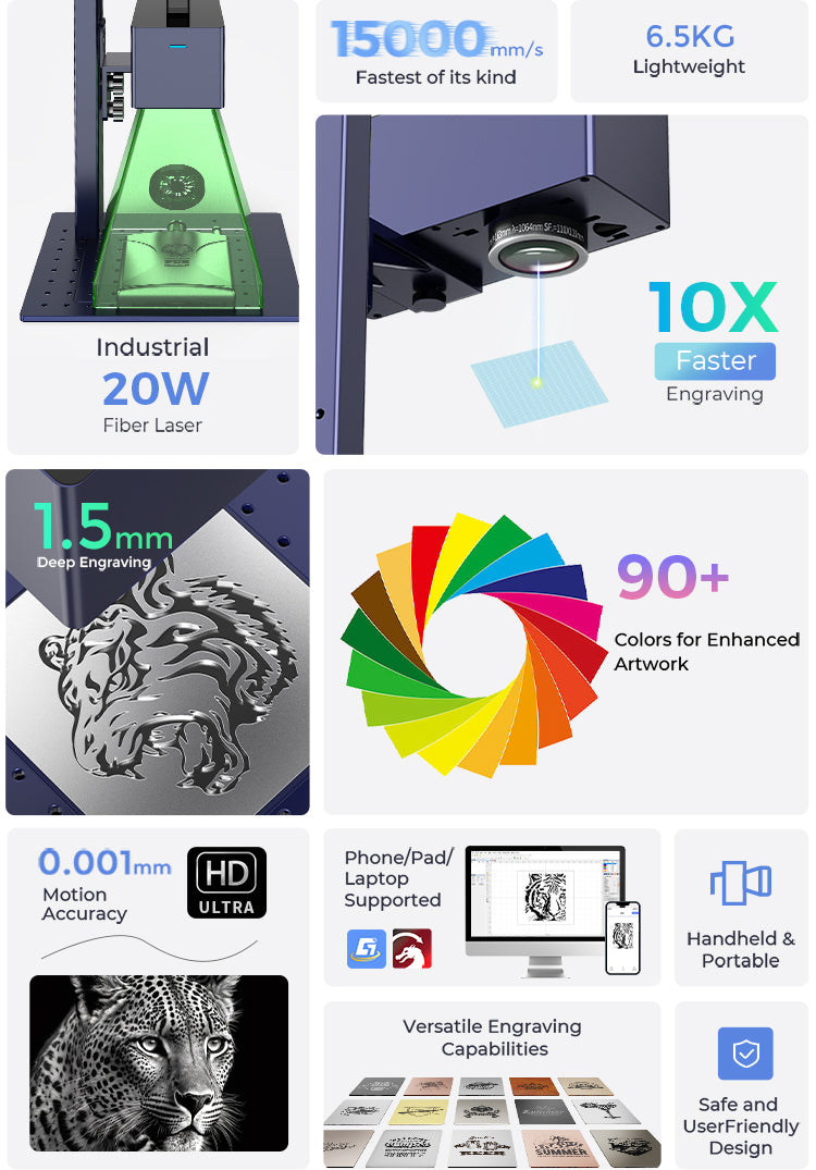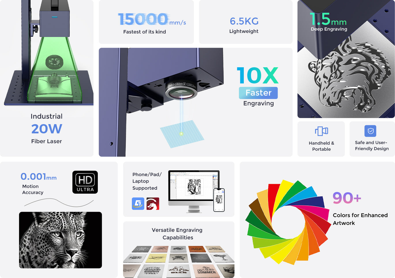 Gweike G2 is outfitted with a state-of-the-art fiber laser lens, a combination that provides unrivaled speed and exceptional stability. Exhibiting an engraving velocity of 15000mm/s, the G2 drastically transcends the capabilities of standard market competitors. It's a significant stride in engraving technology, achieving a speed that's not just faster, but ten times faster! This tenfold increase in speed opens up a wealth of previously unimaginable possibilities.