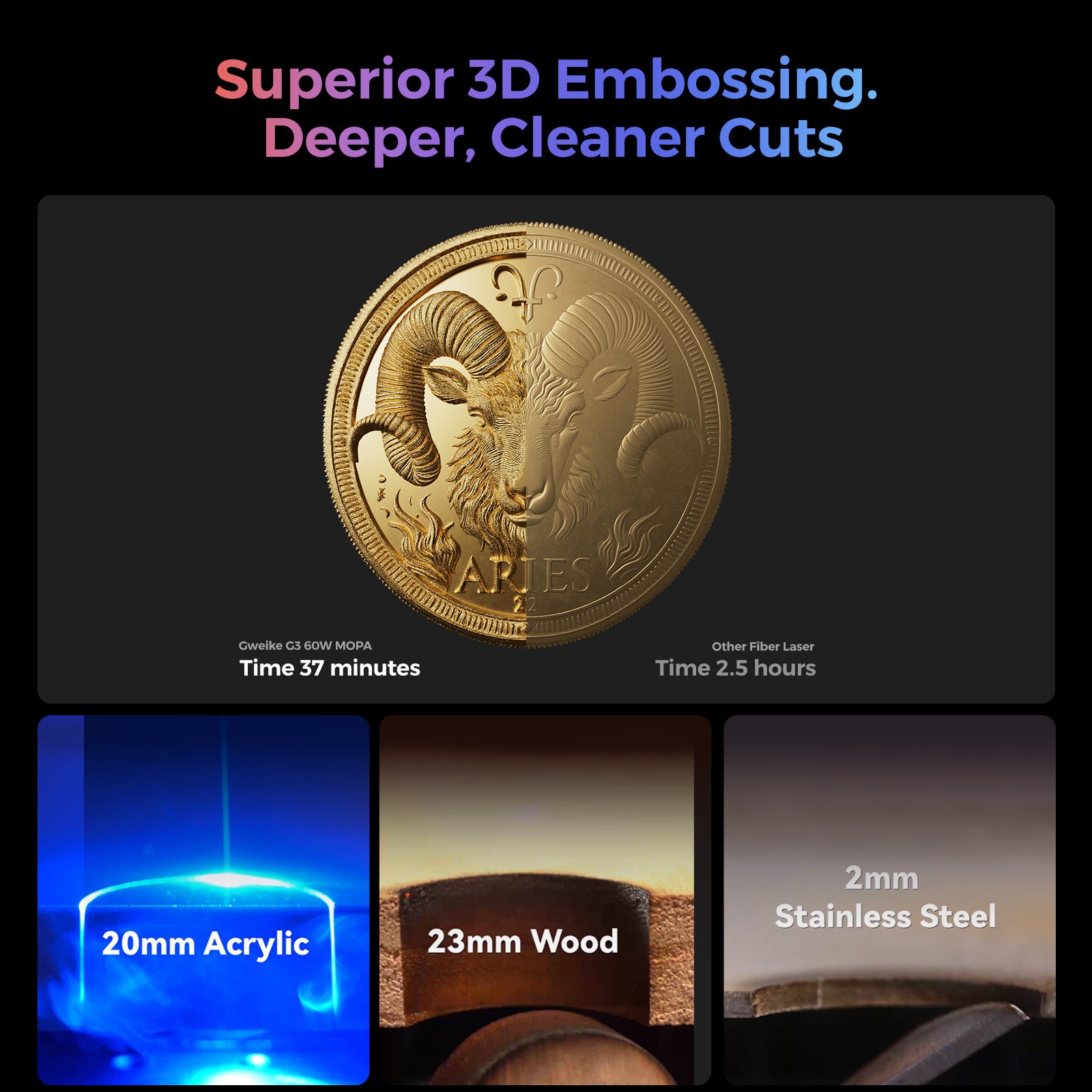 At 100% power, the GWEIKE G3's 60W MOPA laser outperforms 20W fiber lasers — delivering 3x the speed and 200% finer detail.