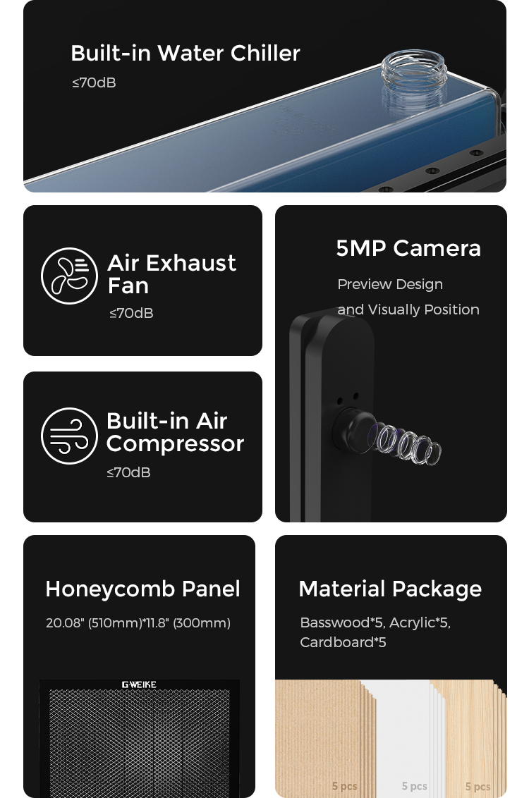 通常の印刷時、gweike cloudの平均騒音レベルは約70 dB(A)です。より静かなファンを搭載し、リアルタイム温度に応じて速度を自動調整することで、約16 dB(A)[3]の騒音レベル低減を実現しました。